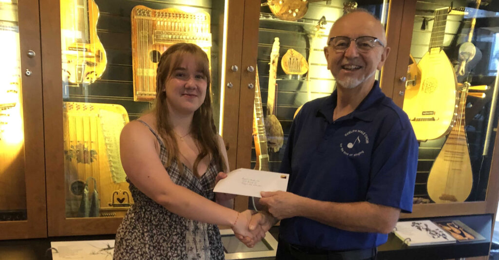 Bob Moore, President of the Guelph Male Choir, presenting Amelia Avdoulos first prize for the Tom Rayner Scholarship Award. The award is sponsored by the Associated Male Choruses of Ontario.